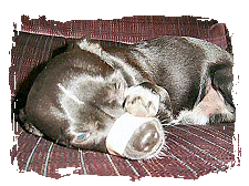 Peanut appeared uninjured this time, so I put him in his cage so I could keep them apart and take a look at Socks. It appeared that this time Peanut had won the fight and put Socks in his place, evening the score. I don’t know if dogs can really think on this level, but that was what it looked like to me. After the fight Socks was limping, and right now his front right leg and the right side of his face are very sore. His limp is almost gone at the moment, since it’s now several hours since the fight, so I think he’s going to make it. Amazingly, Peanut didn’t manage to draw blood. Not that he didn’t try to though… he was hanging on pretty hard to Socks’ cheek!