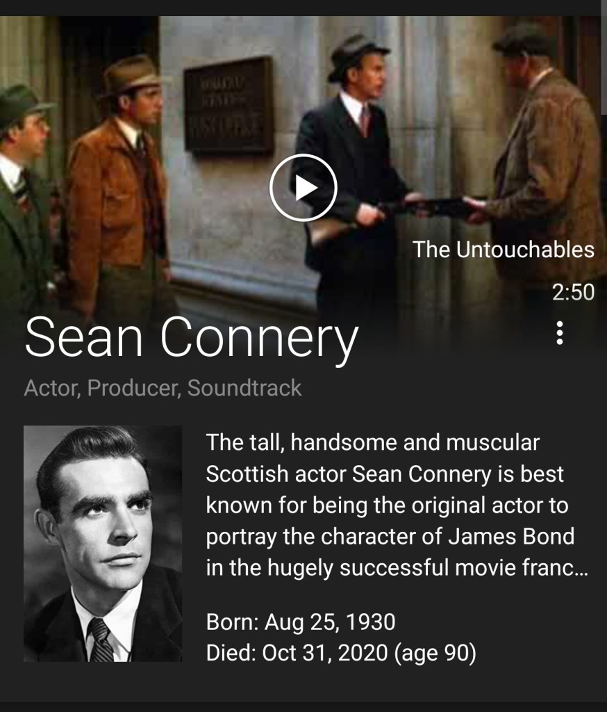 I was sad to hear of Sean Connery’s passing this morning. He was 90 years old. I actually watched The Untouchables two days ago. I was actually looking at a list of Kevin Costner movies at the time, just wanting to watch a good movie of his I hadn’t seen before, and I found The Untouchables. As it turned out, Sean Connery was in that movie, and actually won the Oscar for Best Actor in a Supporting Role for his performance. He died a horrible death in that movie, but his real death was much more peaceful. He died in his sleep, in the Bahamas, with his family around him. I enjoyed many of his movies, and grew up loving his James Bond movies when I was very young. I think he made his first James Bond movie in 1962 – a year before I was born. He will be missed.